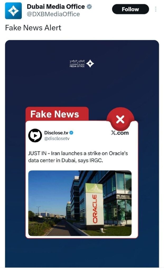 Dubay hökumətinin mətbuat mərkəzi bəyanat yayaraq, sosial şəbəkələrdə və mediada “Oracle” şirkətinin Dubayda yerləşən məlumat mərkəzinə (data-center) hücum edildiyi barədə yayılan şayiələri qətiyyətlə təkzib edib.
